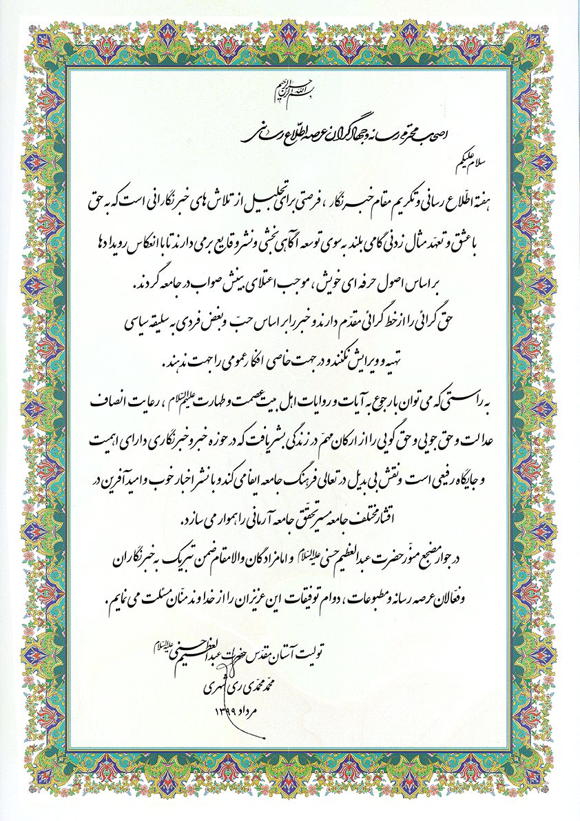 در جوار مضجع منور حضرت عبدالعظیم حسنی (ع ) و امامزادگان والامقام ضمن تبریک به خبرنگاران و فعالان عرصه رسانه و مطبوعات، دوام توفیقات این عزیزان را از خداوند منان مسئلت مینمایم.