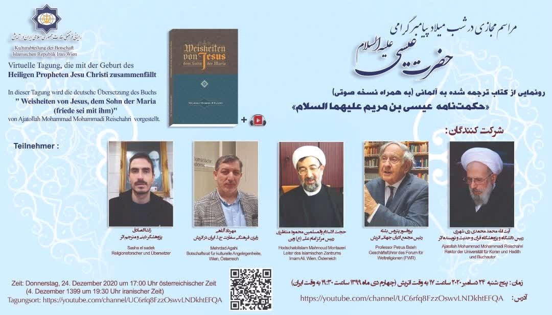 در شب میلاد پیامبر گرامی، حضرت عیسی بن مریم علیهما السلام، مراسم رونمایی از کتاب «حکمت نامه عیسی بن مریم علیهما السلام» ، تألیف آیت الله محمدی ری شهری، به همراه نسخه صوتی، به زبان آلمانی، به صورت مجازی برگزار میگردد.