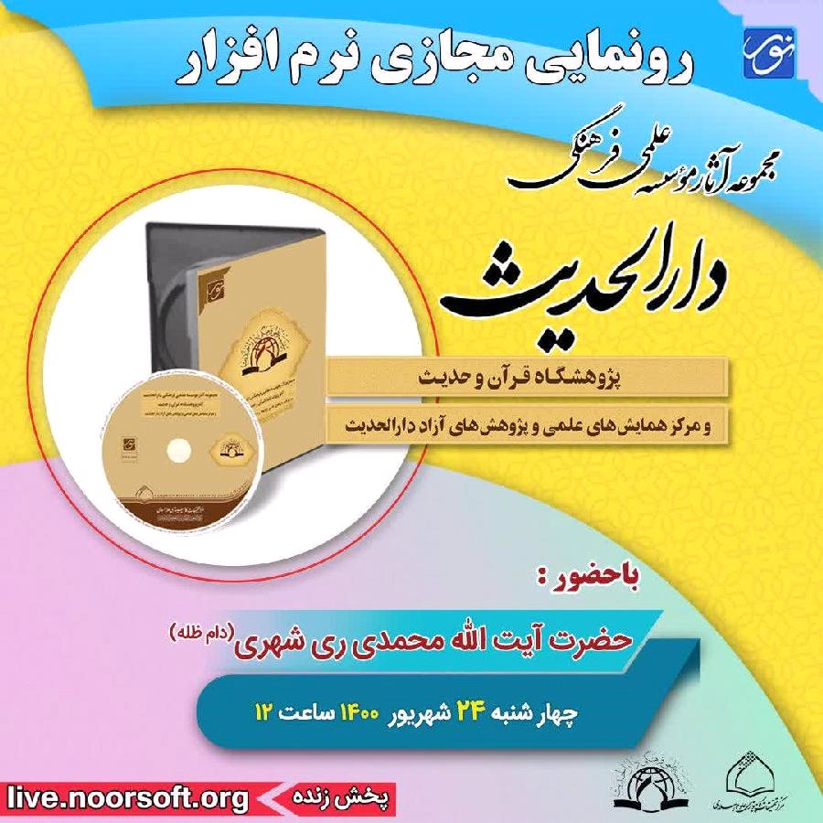 مراسم رونمایی از نرم‌افزار محصولات موسسه دارالحدیث روز چهارشنبه، مورخ ۲۴ شهریور ۱۴۰۰ رأس ساعت ۱۲ به صورت مجازی، با حضور حضرت آیت الله محمدی ری شهری برگزار خواهد شد.