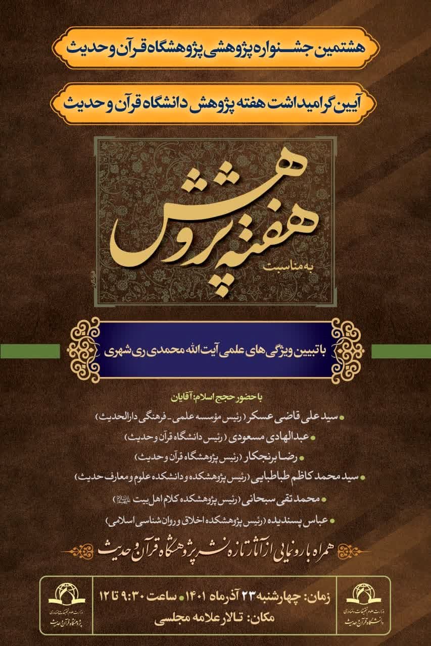 همزمان با هفته پژوهش و با هدف تجلیل و تقدیر از پژوهشگران و اساتید برتر، هشتمین جشنواره پژوهشی پژوهشگاه و دانشگاه قرآن و حدیث، با حضور و سخنرانی حجت الاسلام و المسلمین سیدعلی قاضی عسکر، رئیس موسسه علمی فرهنگی دارالحدیث، برگزار میشود.