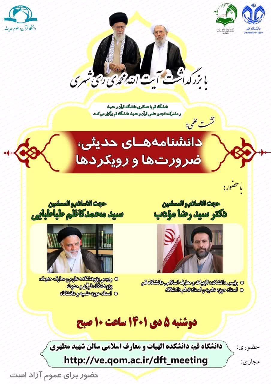 دانشکده الهیات دانشگاه قم با همکاری دانشگاه قرآن و حدیث و مشارکت انجمن علمی قرآن و حدیث دانشگاه قم برگزار می‌کنند: نشست علمی به همراه بزرگداشت آیت الله محمدی ری‌شهری